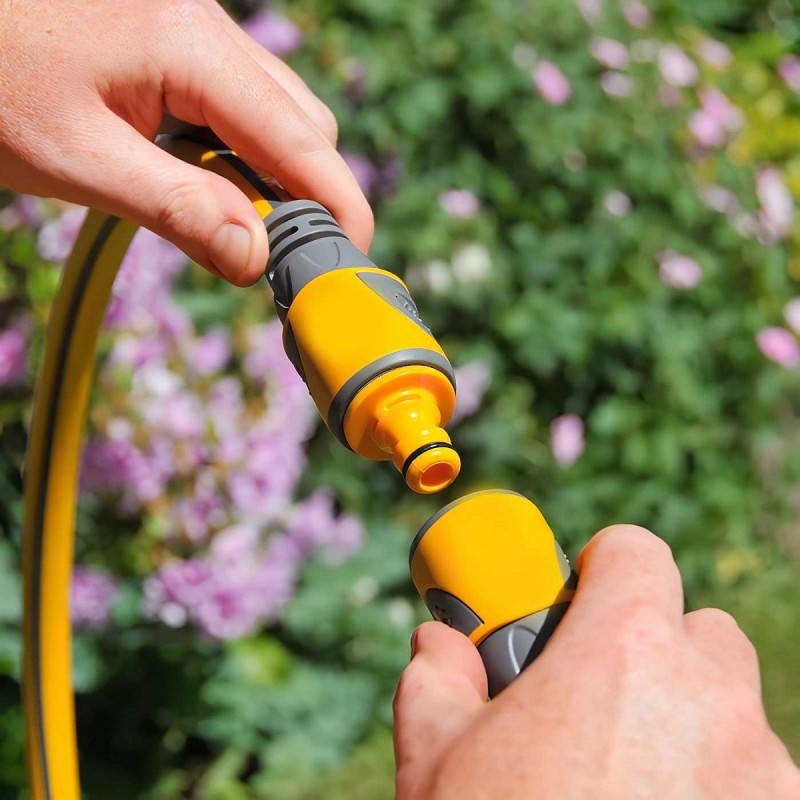 Joins hoses and accessories via 1/2 inch 12.7mm female quick fit garden hose connectors.