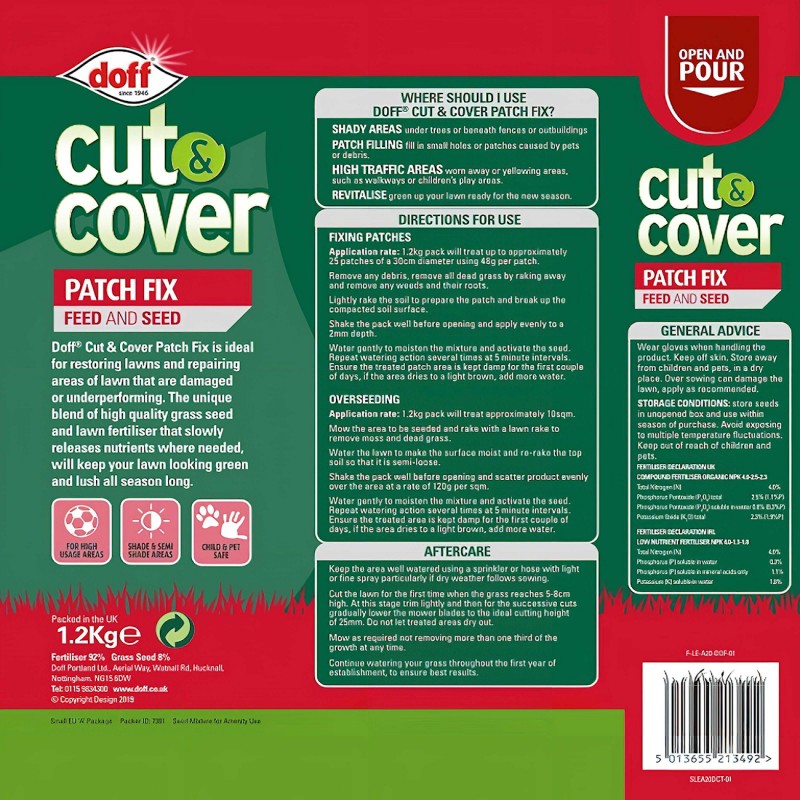 Doff Cut and Cover Lawn Patch Fix contains a unique blend of fast-acting grass seed and lawn feed.