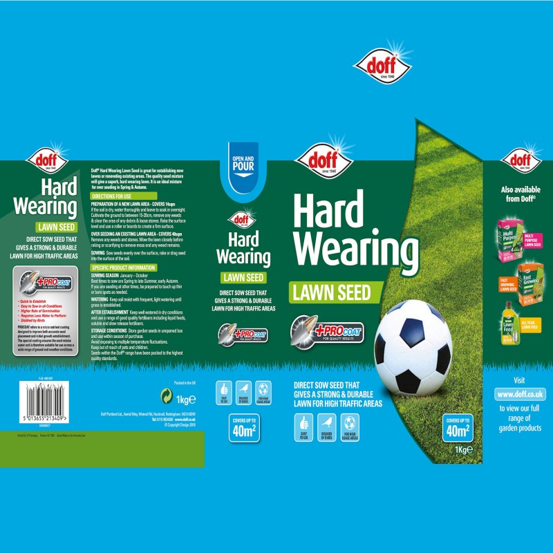 Large 1kg Doff Fast Growing Hard Wearing Lawn Seed a quick and easy to sow.