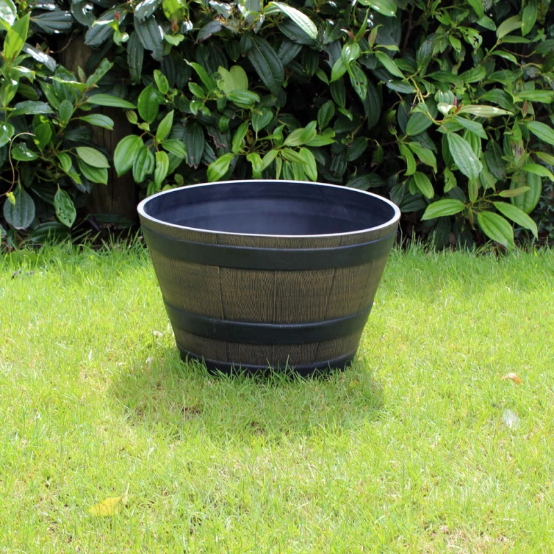 Rustic oak effect barrel for short or long term planting these barrels are suitable for flower displays decorative bush’s etc