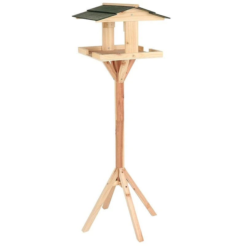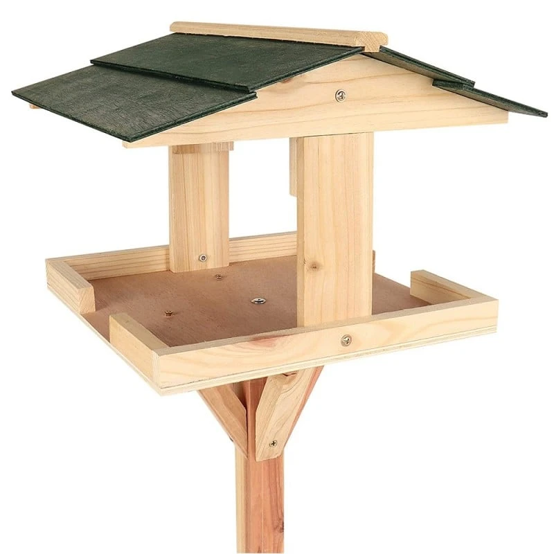 Natural wood finish colouring and a traditional green sheltered roof to provide protection this traditional style bird table