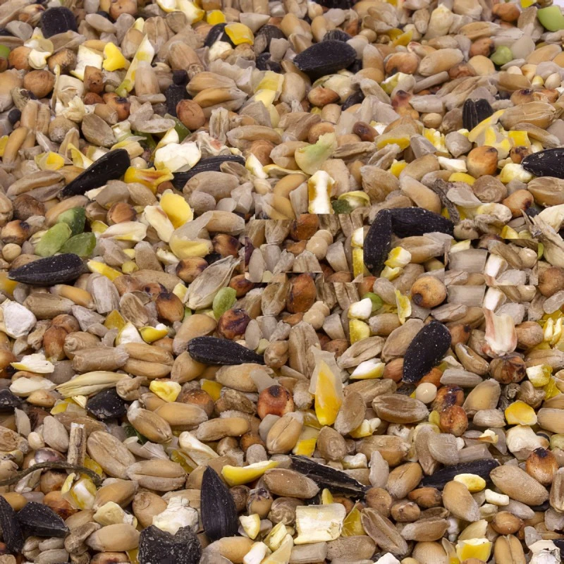 Conservation Grade Wheat, Cerial, Chopped Maize, Red Dari, Conservation Grade Oats, Black sunflower seeds and Rapeseed Oil.