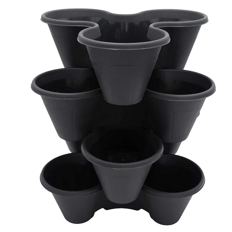 Black plastic single or stackable plant pots ideal for strawberries, flowers and herbs cultivation if planted as a single layer you have 4 planting areas when stacking you have 3 on the lower levels.