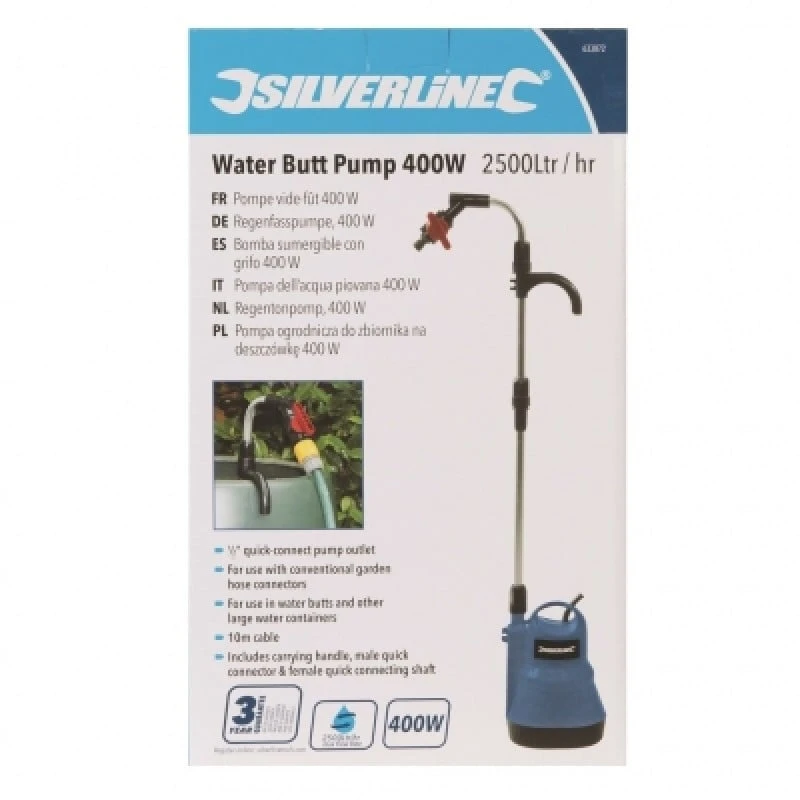 400W electric water pump for use in water butts and other large water containers.
